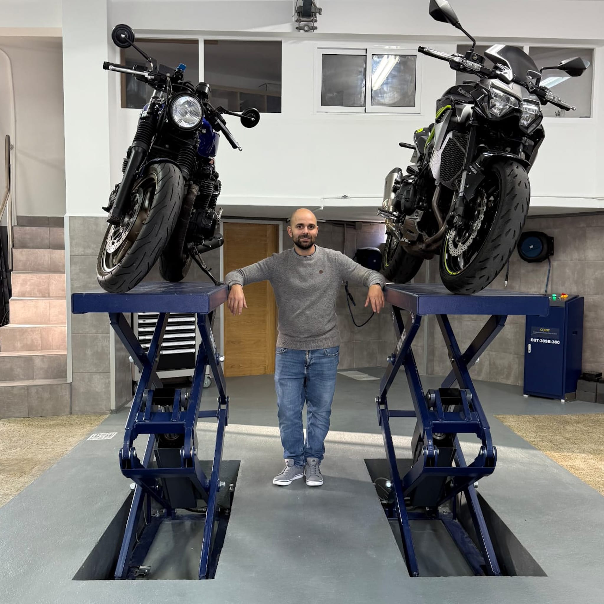 Elevador profesional para la inspección detallada del bajo del vehículo y del chasis de motocicletas.